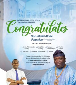 A financial expert and community leader, Biodun Coker (FCCA, AFA), has congratulated the Executive Chairman of Lagos Island East Local Council Development Area (LCDA), Hon. Muibi Alade Folawiyo, on the successful commissioning of a series of landmark projects under his administration.