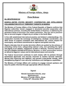 The Ministry of Foreign Affairs of the Federal Republic of Nigeria confirms that Nigerian authorities remain engaged in structured security cooperation with international partners, including the United States of America, in addressing the persistent threat of terrorism and violent extremism. This has led to precision hits on terrorist targets in Nigeria by air strikes in the North West.