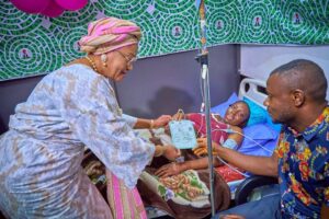 Accompanied by wife of Vice President, Hajia Nana Shettima, Minister of Women Affairs, Hajia Imaan Sulieman-Ibrahim and Minister of State for Federal Capital Territory, Hajia Mariya Mahmoud among other dignitaries, Senator Oluremi Tinubu welcomed the “First Baby of the Year,” a girl born at midnight to 26-year-old first-time mother Adakole Patience. She also celebrated Blessing Oragwu, who gave birth to triplets on the 29th of December 2025—two boys and a girl—after 13 years of marriage, presenting the family with gifts.