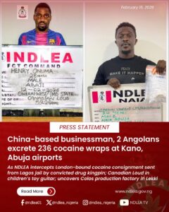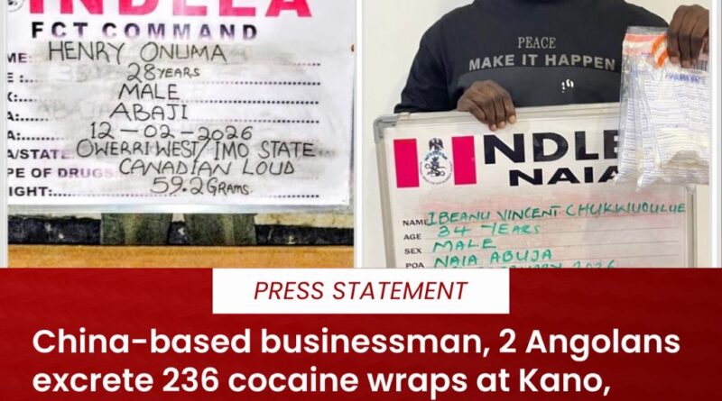 A China-based Nigerian businessman, Ibeanu Vincent Chukwudulue and two Angolan citizens: Mbandu Martins Makiadi and Ngoma Wilson Fernando have excreted a total of 236 wraps of cocaine following their arrest by operatives of the National Drug Law Enforcement Agency (NDLEA) at the Nnamdi Azikiwe International Airport Abuja and Mallam Aminu Kano International Airport, Kano, respectively.