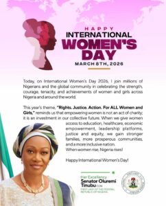 Nigeria’s First Lady, Oluremi Tinubu, has joined millions of Nigerians and the global community to celebrate the achievements and resilience of women as the world commemorates International Women’s Day 2026.