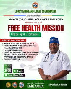 In furtherance of his administration’s commitment to strengthening primary healthcare delivery and promoting the well-being of residents, the Executive Chairman of Lagos Mainland Local Government, Mayor (Dr.) Jubril Kolawole Emilagba, will flag off the 8th Phase of the Free Health Mission, a strategic community-based medical outreach aimed at improving access to essential healthcare services.