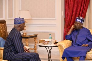 Former Governor of Lagos State and immediate past Minister of Works and Housing, Babatunde Raji Fashola, SAN; President Bola Ahmed Tinubu; and former President of the Nigerian Bar Association (NBA), Chief Wole Olanipekun, during an Easter courtesy visit to the President in Lagos on Sunday, April 5, 2026.